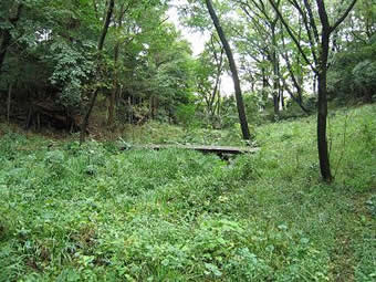 斜面林の高木・亜高木層には、クマシデ、コナラ、クヌギなどの落葉広葉樹(二次林:かつての薪炭林)が優占しており、低木層にはこれらの幼樹のほかにアオキ、シラカシ、ヤツデ、シュロなどの常緑樹広葉樹が見られます。