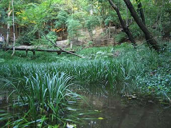 斜面林のほぼ中央部には谷戸部があり、湧水が湧出しています。セキショウが大きな群落を形成しており、周辺の斜面はモウソウチクの竹林となっています。