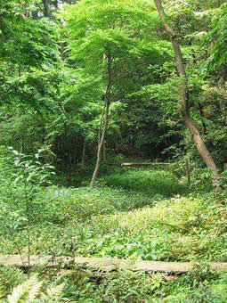 斜面林の高木・亜高木層には、クマシデ、コナラ、クヌギなどの落葉広葉樹(二次林:かつての薪炭林)が優占しており、低木層にはこれらの幼樹のほかにアオキ、シラカシ、ヤツデ、シュロなどの常緑樹広葉樹が見られます。林床にはキンラン・ギンランをはじめとした23区内では貴重な植物が生育しています。湧水からの流れの周辺にはセキショウが大きな群落を形成し、ハンノキなどの湿性植物も生育しています。