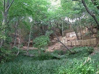 斜面林のほぼ中央部には谷戸部があり、湧水が湧出しています。セキショウが大きな群落を形成しており、周辺の斜面はモウソウチクの竹林となっています。